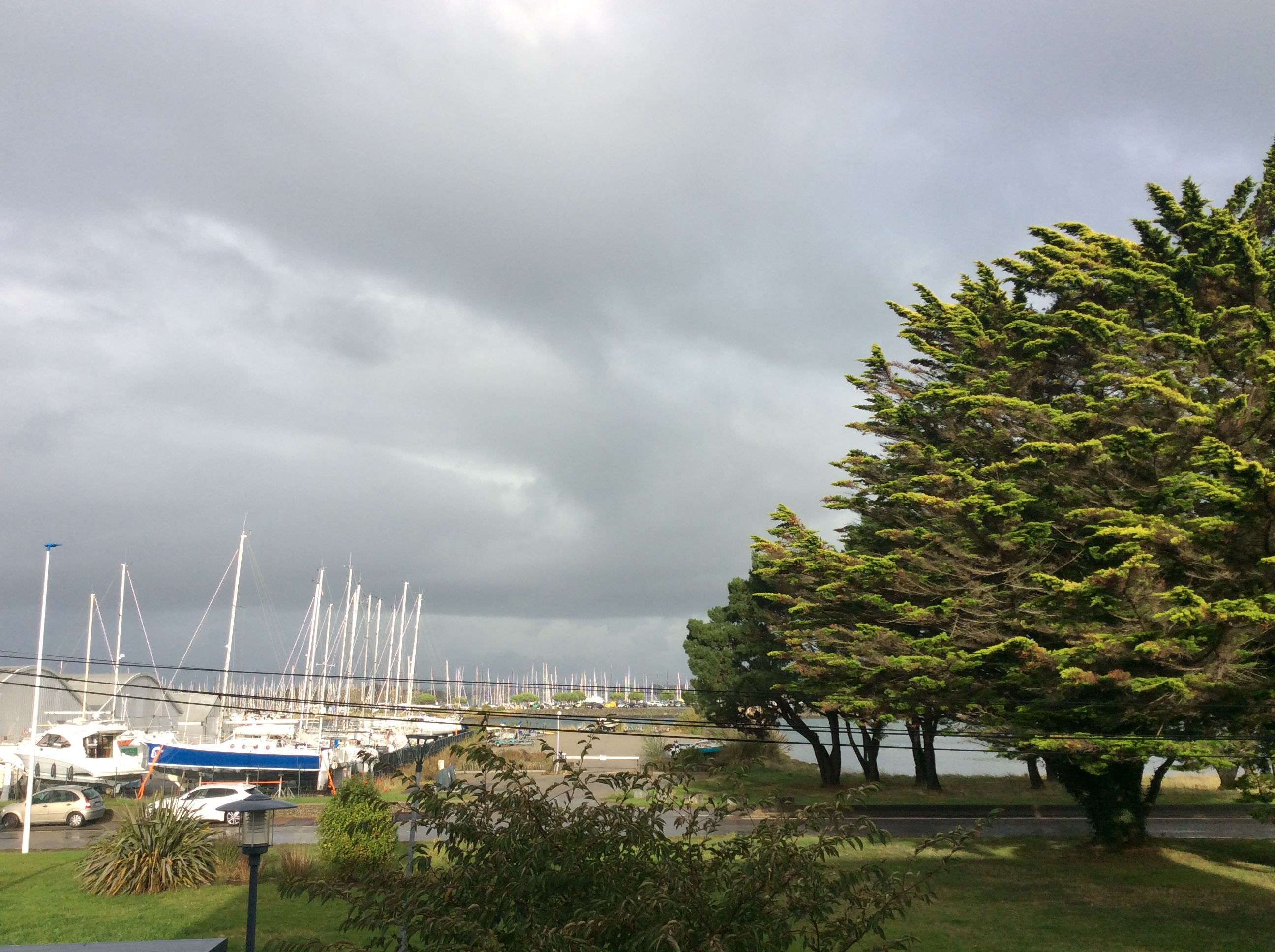 Très couvert avec une averse de temps en temps, très doux, 18°, presque pas de vent