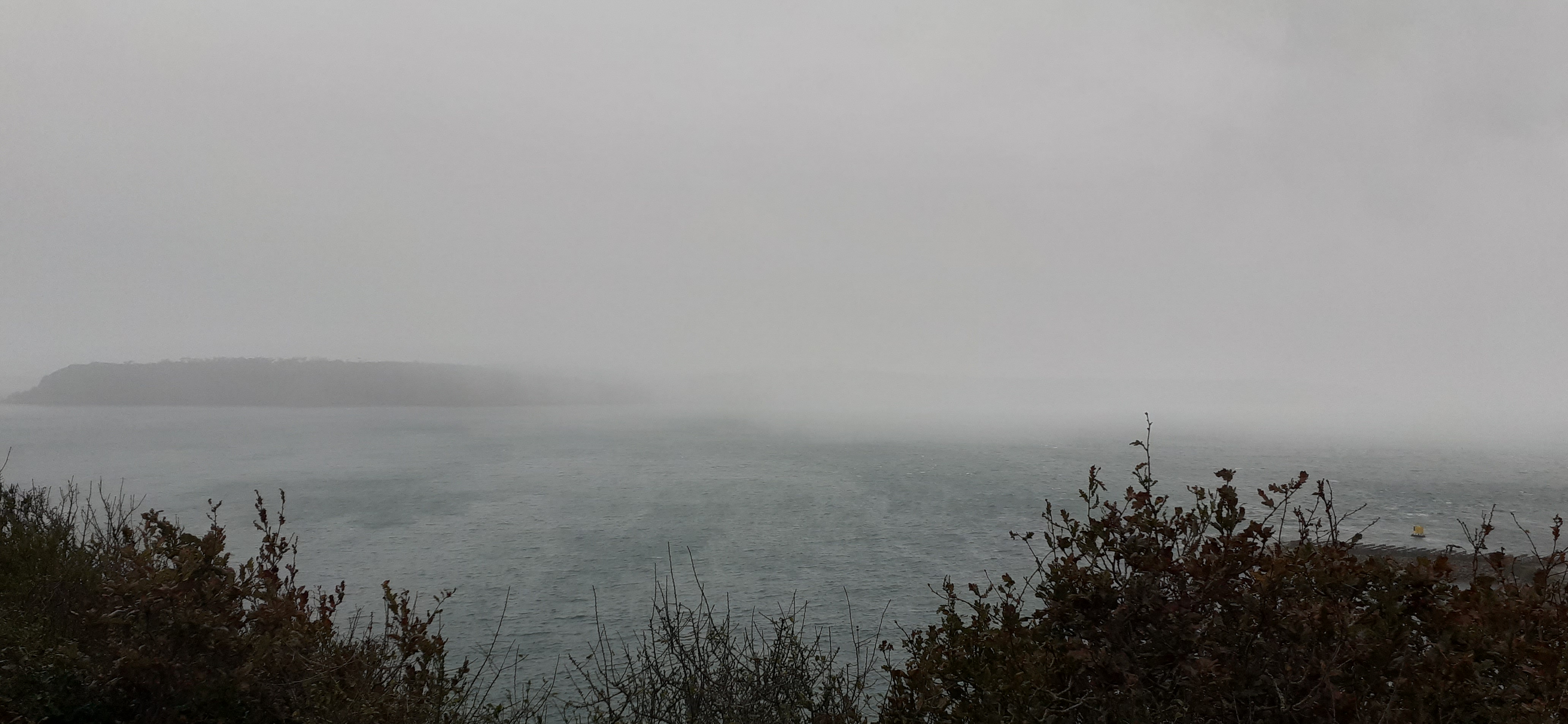 Pluie régulière. Brouillard en rade.